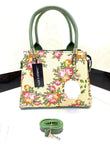 This elegant floral pattern handbag is a perfect blend of sophistication and style. Crafted from high-quality material, it features a vibrant, intricate floral design that adds a touch of nature's beauty to your ensemble. The spacious interior is complemented by a sleek and sturdy handle, designed for both comfort and ease of carrying. The bag also boasts a charming accent, such as a decorative charm or keychain, attached to the handle, offering a personalized and trendy flair. Whether for everyday use or a special occasion, this handbag serves as both a functional and fashionable accessory.